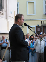 Po další písničce přišel na chrámové schody sv. Mikuláše, které sloužily jako řečnická tribuna jakýsi nepředstavený pán, a začal říkat, že největší právo na Palestinu mají přece Palestinci. Jak jsem najednou poslouchal a fotil a zapisoval, neměl jsem volné žádné ruce k praní - to zastali na zavolání páni policisté. Fakt je, že když si onen provokatér sedl, nehnuli s ním ani tři. Až ho odnesl čtvrtý - Samson z publika. Pán pak křičel jako tur, když ho strkali do policejního auta, aby přivolal pozornost médií. On to nejspíše myslel dobře - ale na špatném místě.